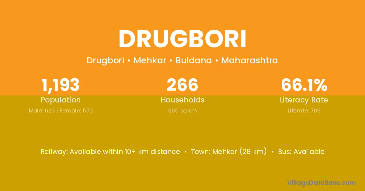 Mehkar (28 km) is the nearest town to Drugbori village for major economic activities and is located approximately 28 km away.