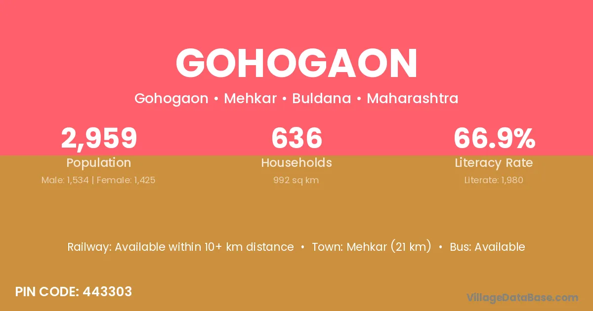 Mehkar (21 km) is the nearest town to Gohogaon village for major economic activities and is located approximately 21 km away.