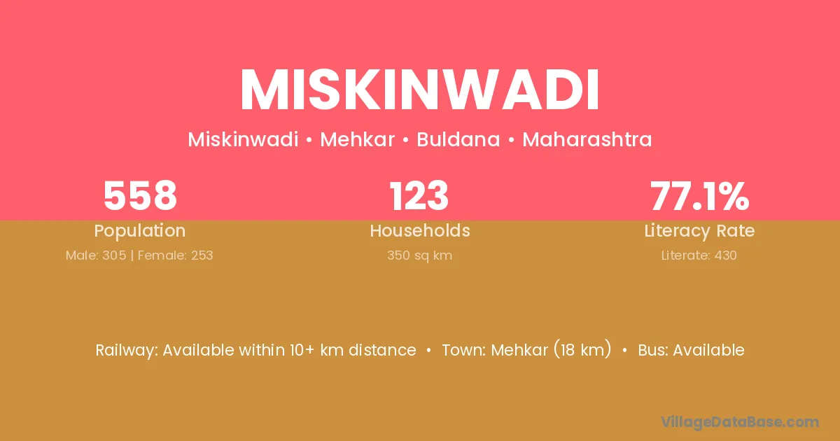 Mehkar (18 km) is the nearest town to Miskinwadi village for major economic activities and is located approximately 18 km away.