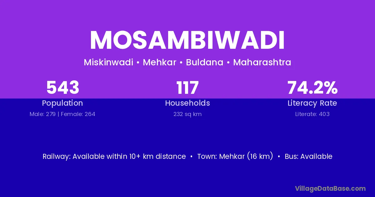 Mosambiwadi village has a total population of 543 people, of which 279 are males and 264 are females.