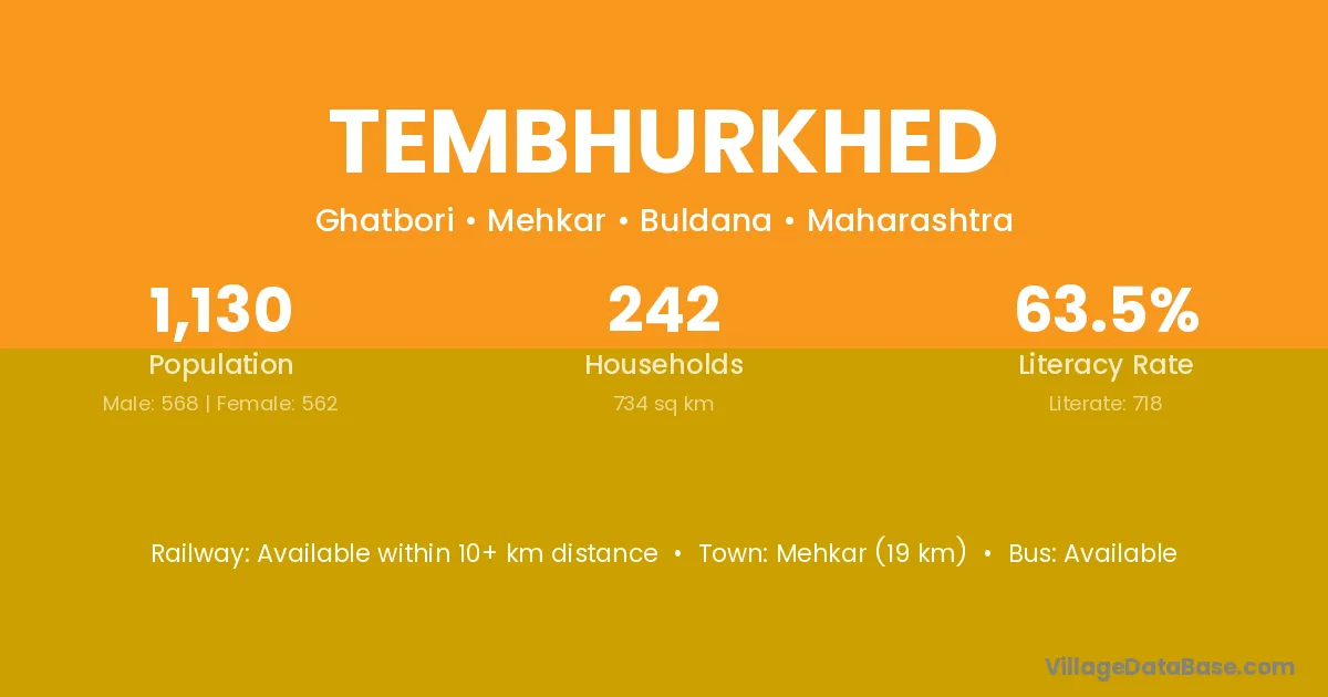 Tembhurkhed village has a total population of 1,130 people, of which 568 are males and 562 are females.