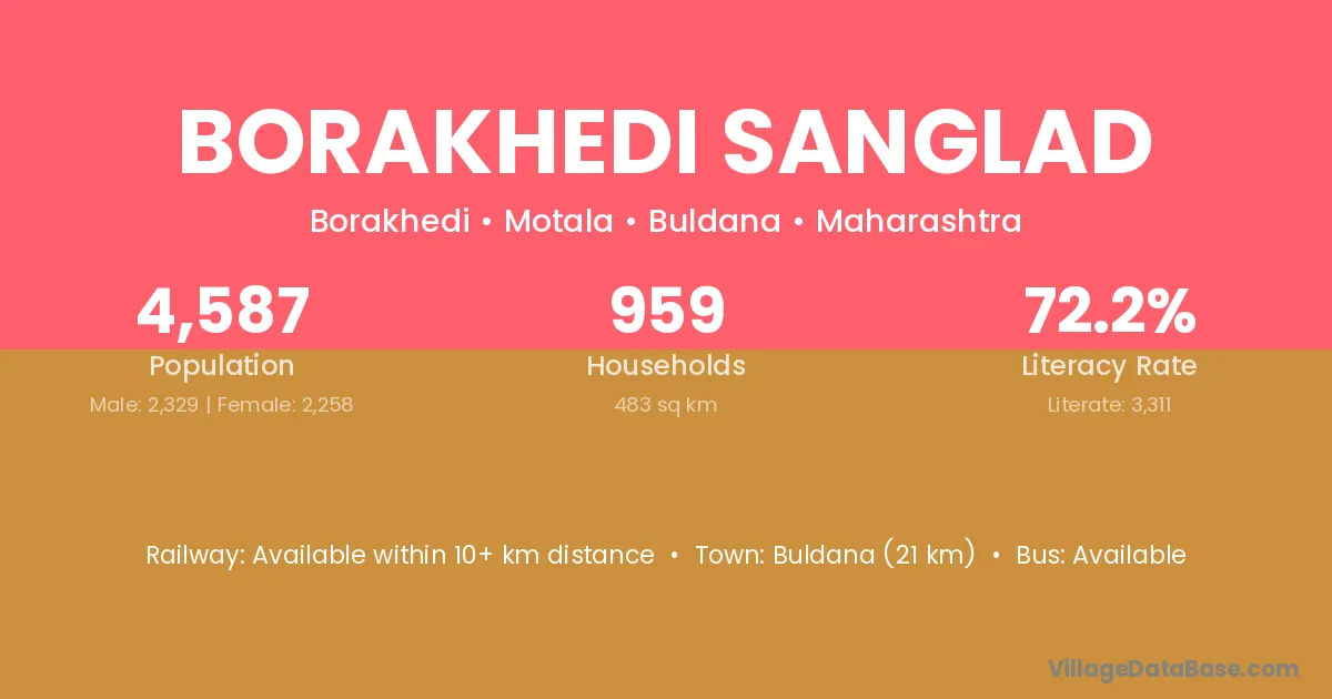 Buldana (21 km) is the nearest town to Borakhedi Sanglad village for major economic activities and is located approximately 21 km away.