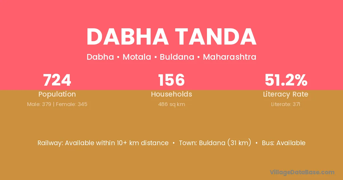 Buldana (31 km) is the nearest town to Dabha Tanda village for major economic activities and is located approximately 31 km away.