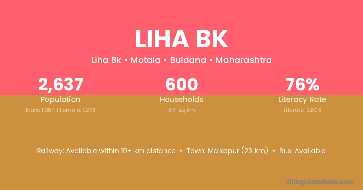 Malkapur (23 km) is the nearest town to Liha Bk village for major economic activities and is located approximately 23 km away.