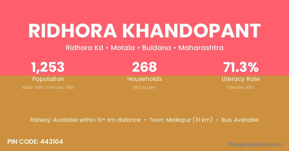 Malkapur (31 km) is the nearest town to Ridhora Khandopant village for major economic activities and is located approximately 31 km away.