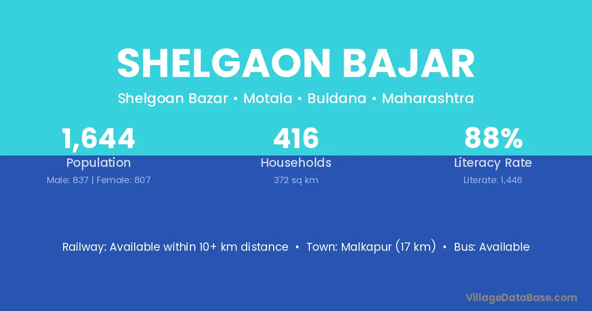 Malkapur (17 km) is the nearest town to Shelgaon Bajar village for major economic activities and is located approximately 17 km away.