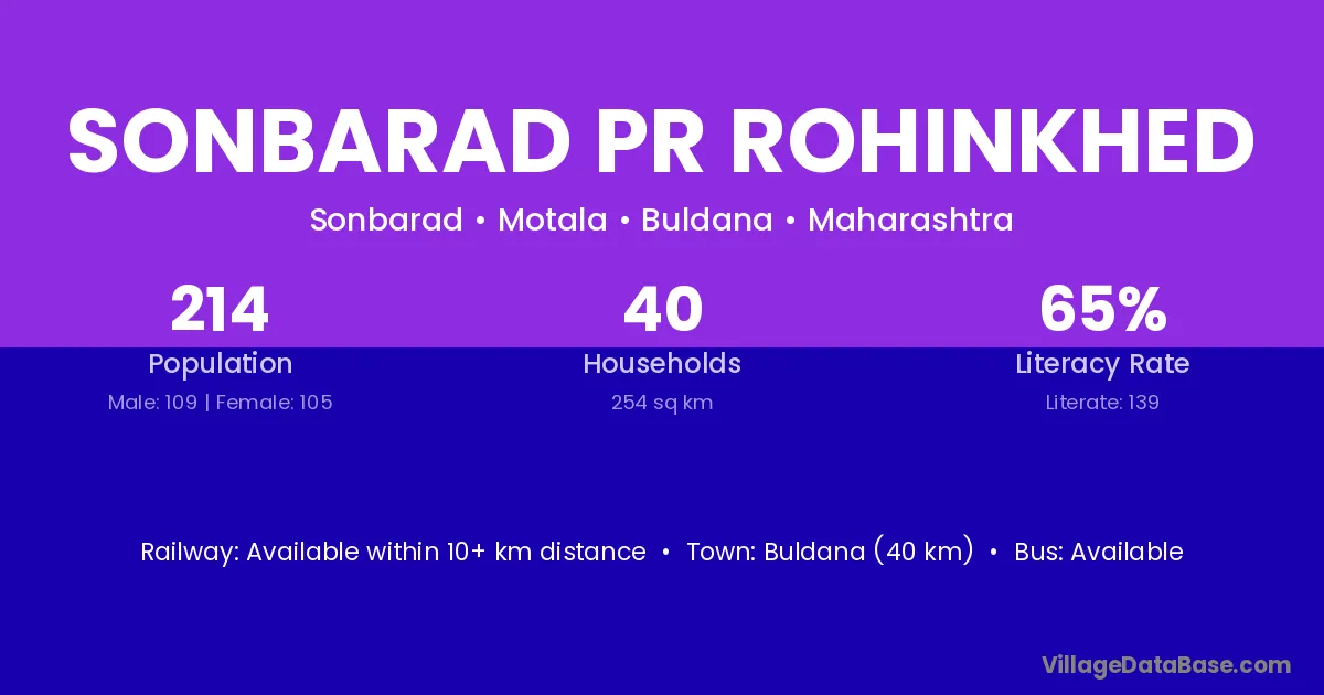 Sonbarad Pr Rohinkhed village has a total population of 214 people, of which 109 are males and 105 are females.