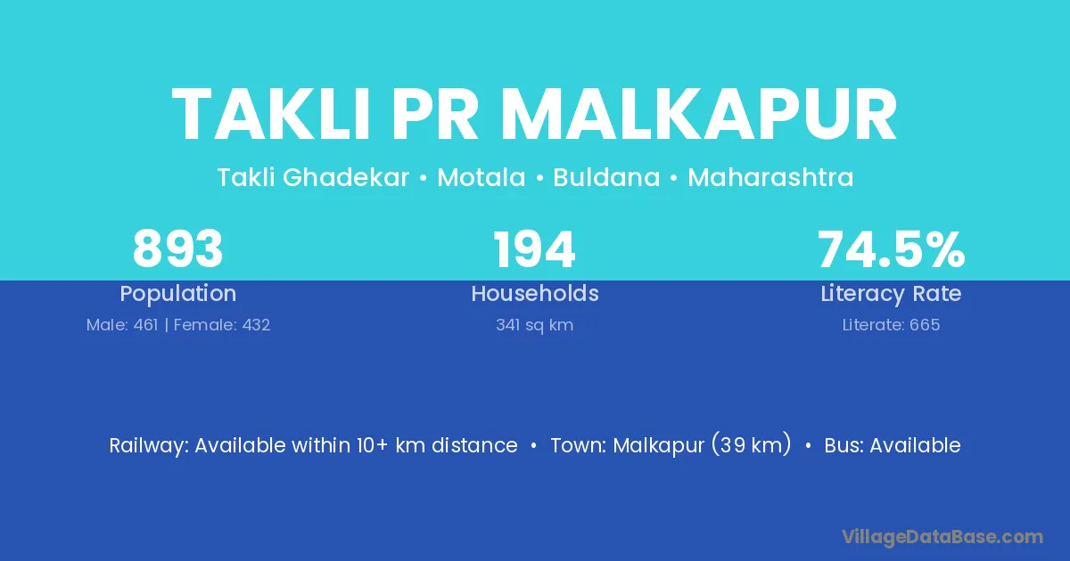 Takli Pr Malkapur village has a total population of 893 people, of which 461 are males and 432 are females.