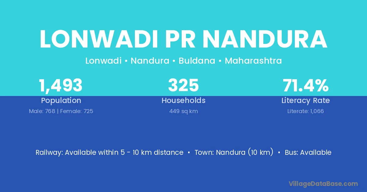 Lonwadi Pr Nandura village has a total population of 1,493 people, of which 768 are males and 725 are females.