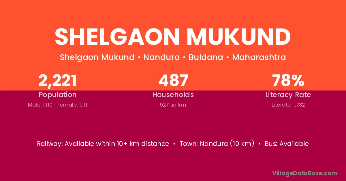 Shelgaon Mukund village has a total population of 2,221 people, of which 1,110 are males and 1,111 are females.
