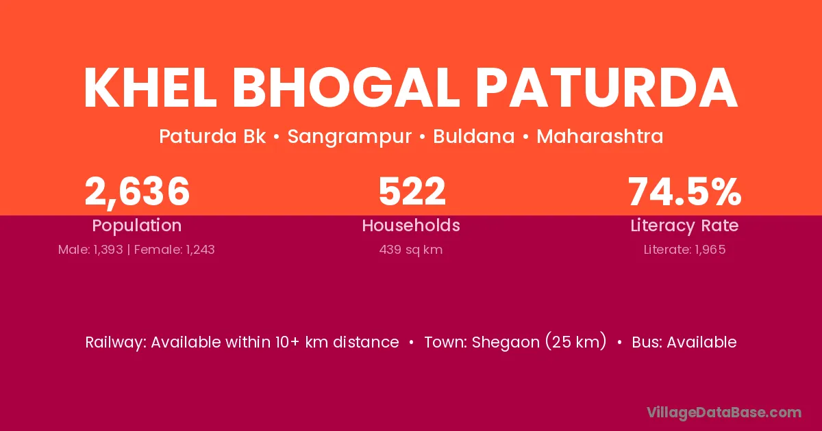Shegaon (25 km) is the nearest town to Khel Bhogal Paturda village for major economic activities and is located approximately 25 km away.