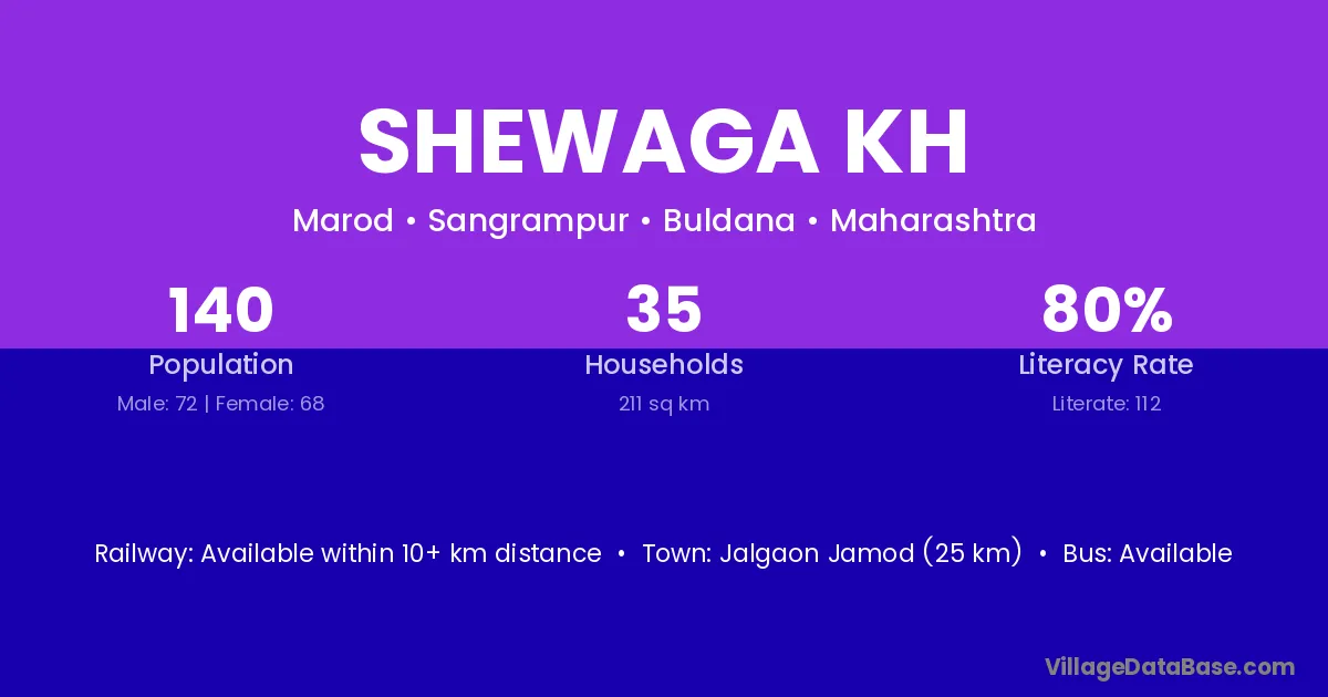 Jalgaon Jamod (25 km) is the nearest town to Shewaga Kh village for major economic activities and is located approximately 25 km away.