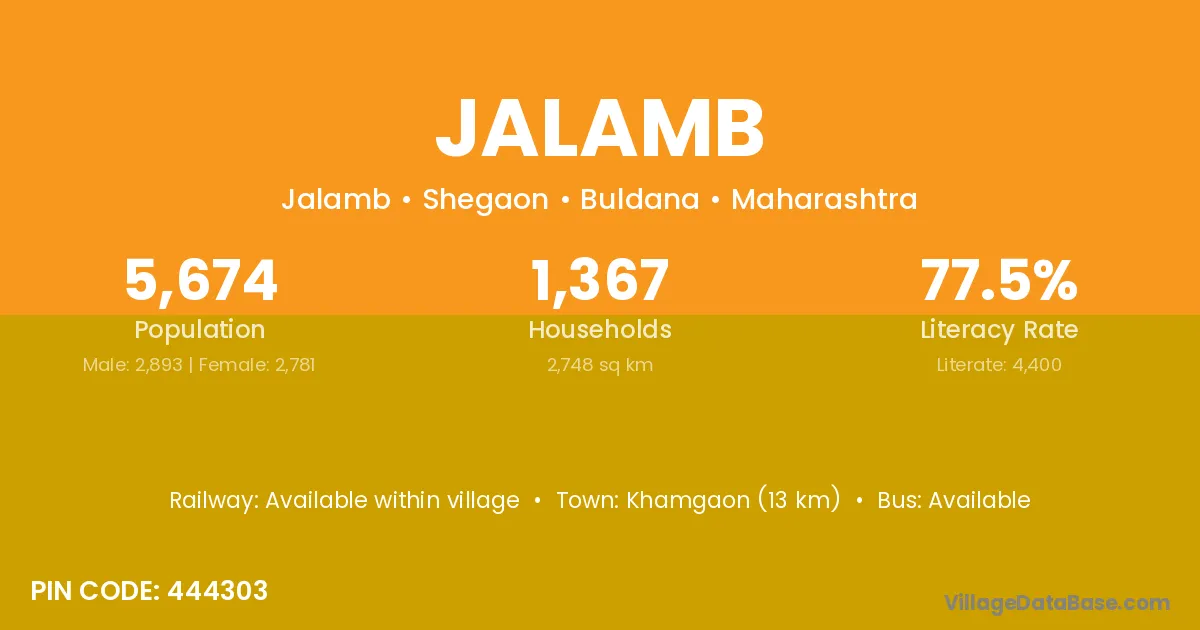 Khamgaon (13 km) is the nearest town to Jalamb village for major economic activities and is located approximately 13 km away.