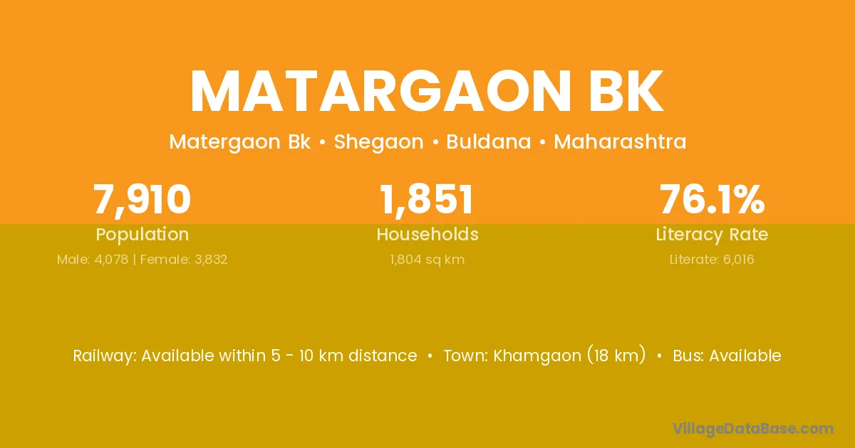 Khamgaon (18 km) is the nearest town to Matargaon Bk village for major economic activities and is located approximately 18 km away.