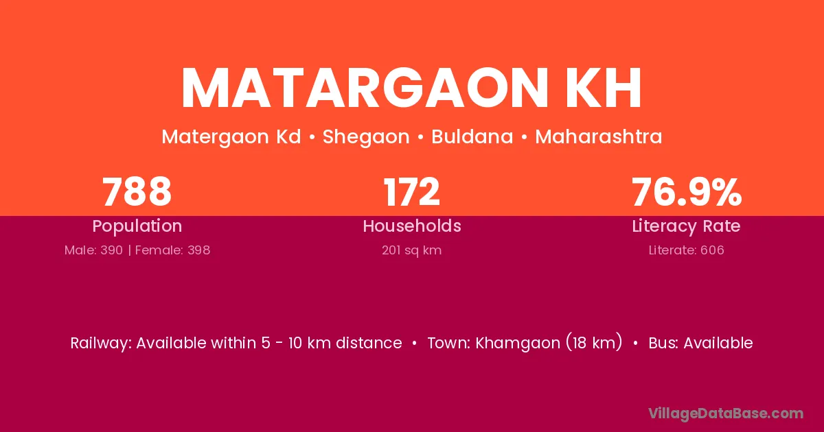 Khamgaon (18 km) is the nearest town to Matargaon Kh village for major economic activities and is located approximately 18 km away.