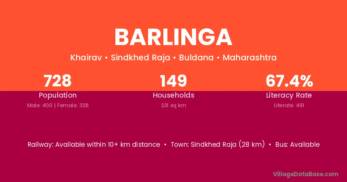 Sindkhed Raja (28 km) is the nearest town to Barlinga village for major economic activities and is located approximately 28 km away.