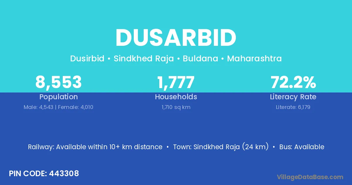 Sindkhed Raja (24 km) is the nearest town to Dusarbid village for major economic activities and is located approximately 24 km away.