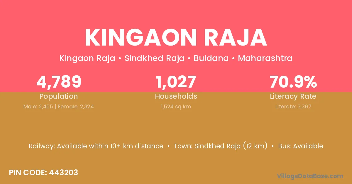 Sindkhed Raja (12 km) is the nearest town to Kingaon Raja village for major economic activities and is located approximately 12 km away.
