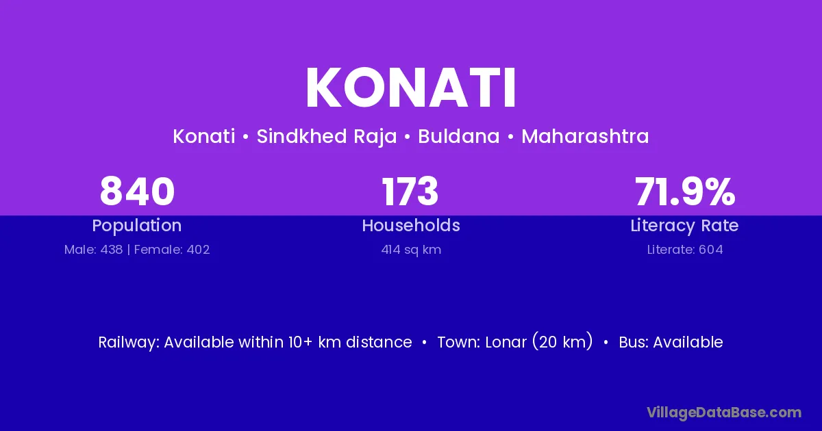 Lonar (20 km) is the nearest town to Konati village for major economic activities and is located approximately 20 km away.