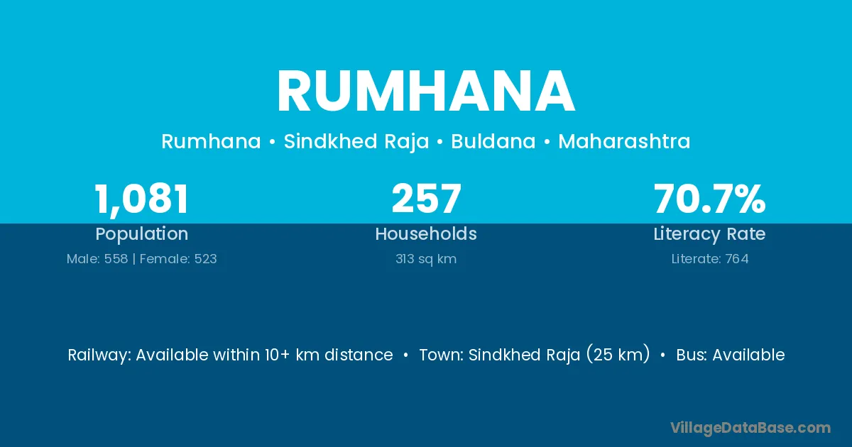 Sindkhed Raja (25 km) is the nearest town to Rumhana village for major economic activities and is located approximately 25 km away.