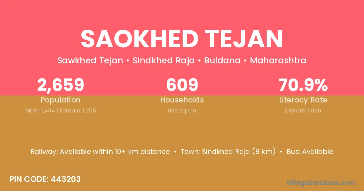 Sindkhed Raja (8 km) is the nearest town to Saokhed Tejan village for major economic activities and is located approximately 8 km away.