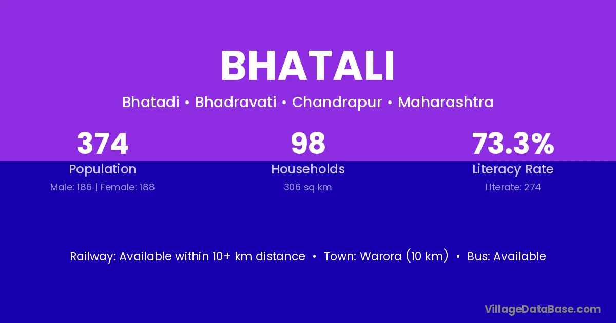 Warora (10 km) is the nearest town to Bhatali village for major economic activities and is located approximately 10 km away.