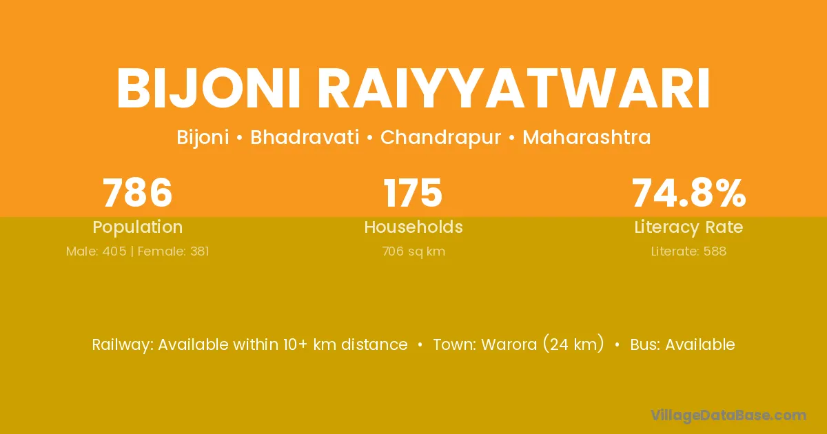 Warora (24 km) is the nearest town to Bijoni Raiyyatwari village for major economic activities and is located approximately 24 km away.
