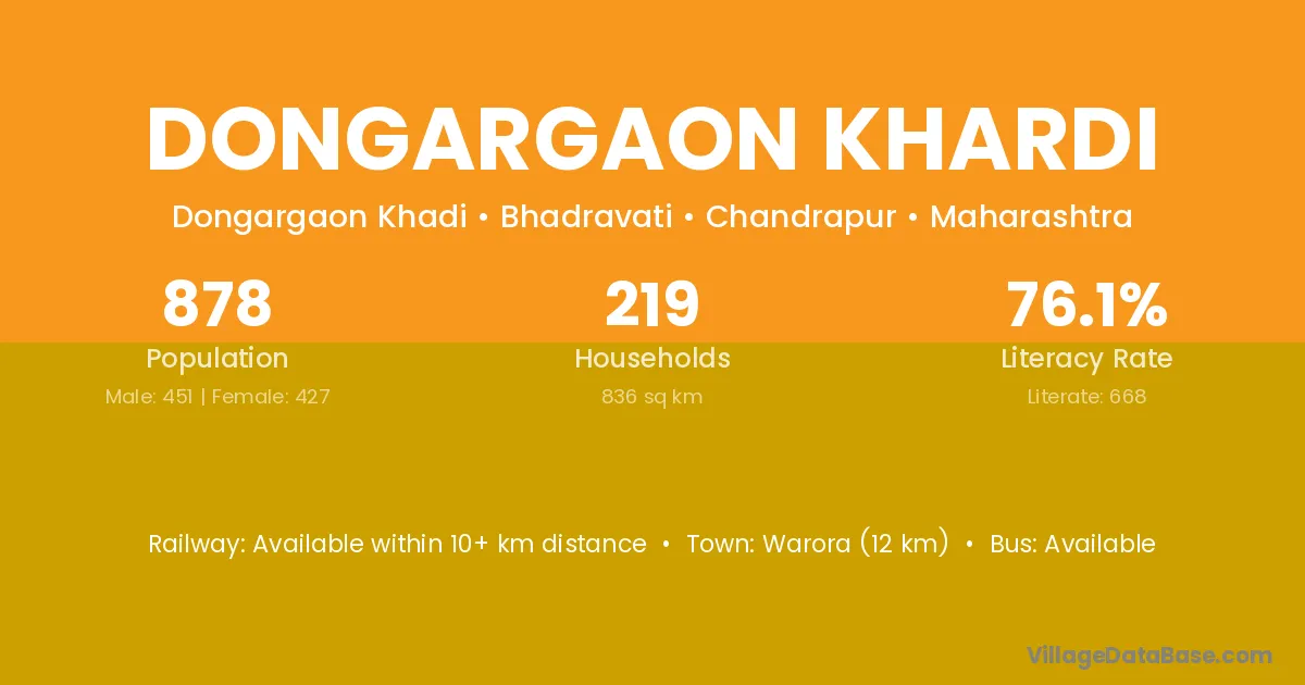 Dongargaon Khardi village has a total population of 878 people, of which 451 are males and 427 are females.