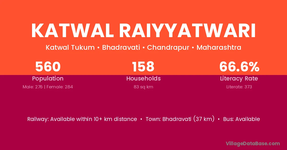 Bhadravati (37 km) is the nearest town to Katwal Raiyyatwari village for major economic activities and is located approximately 37 km away.