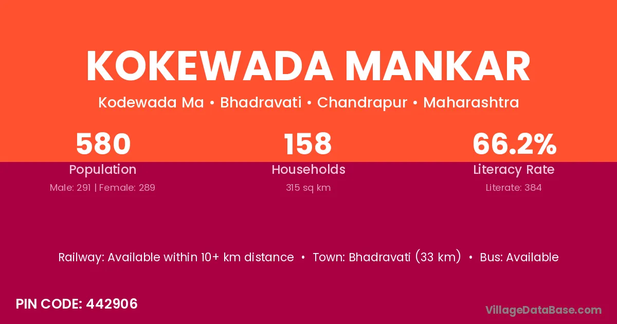Kokewada Mankar village has a total population of 580 people, of which 291 are males and 289 are females.