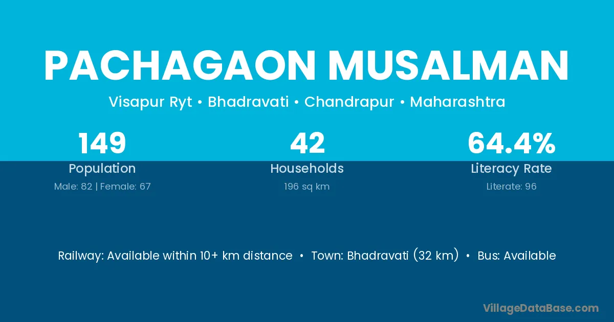 Bhadravati (32 km) is the nearest town to Pachagaon Musalman village for major economic activities and is located approximately 32 km away.