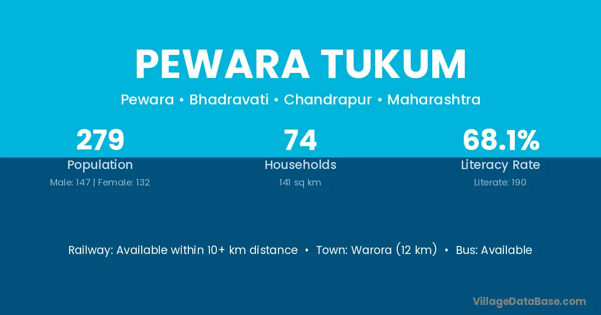 Warora (12 km) is the nearest town to Pewara Tukum village for major economic activities and is located approximately 12 km away.