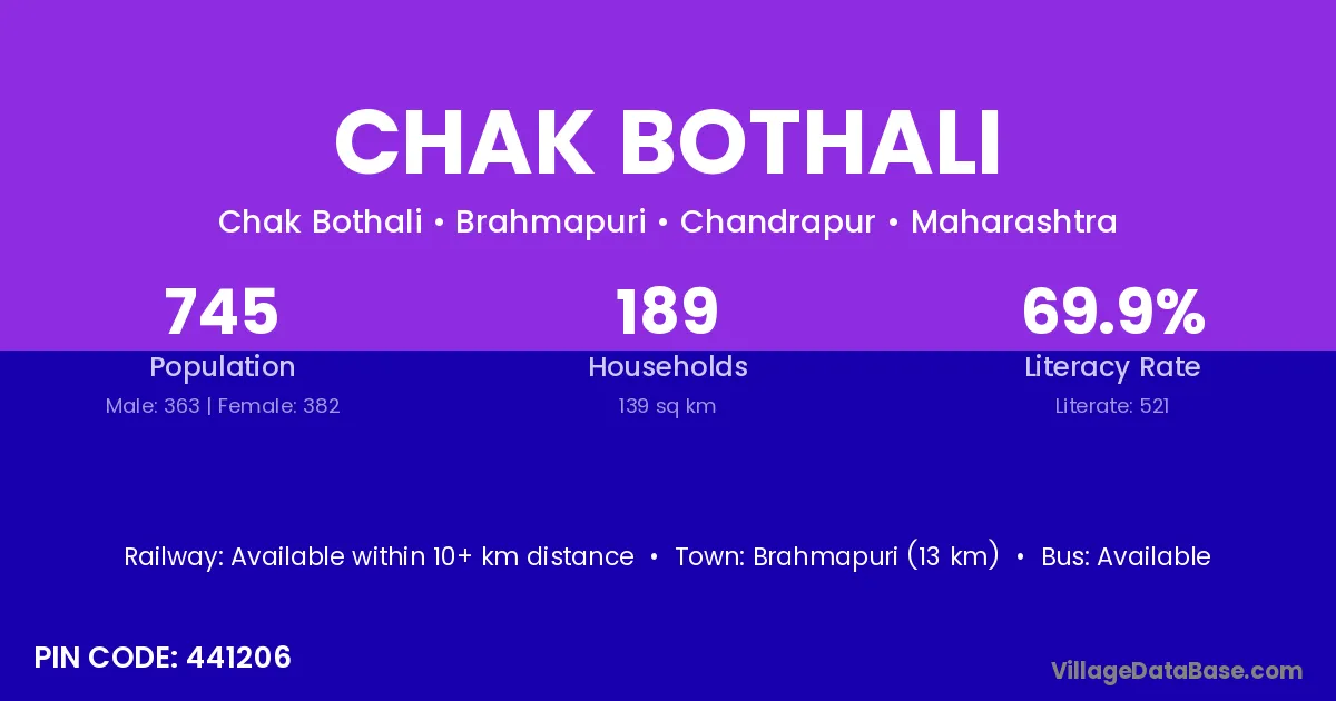 Brahmapuri (13 km) is the nearest town to Chak Bothali village for major economic activities and is located approximately 13 km away.