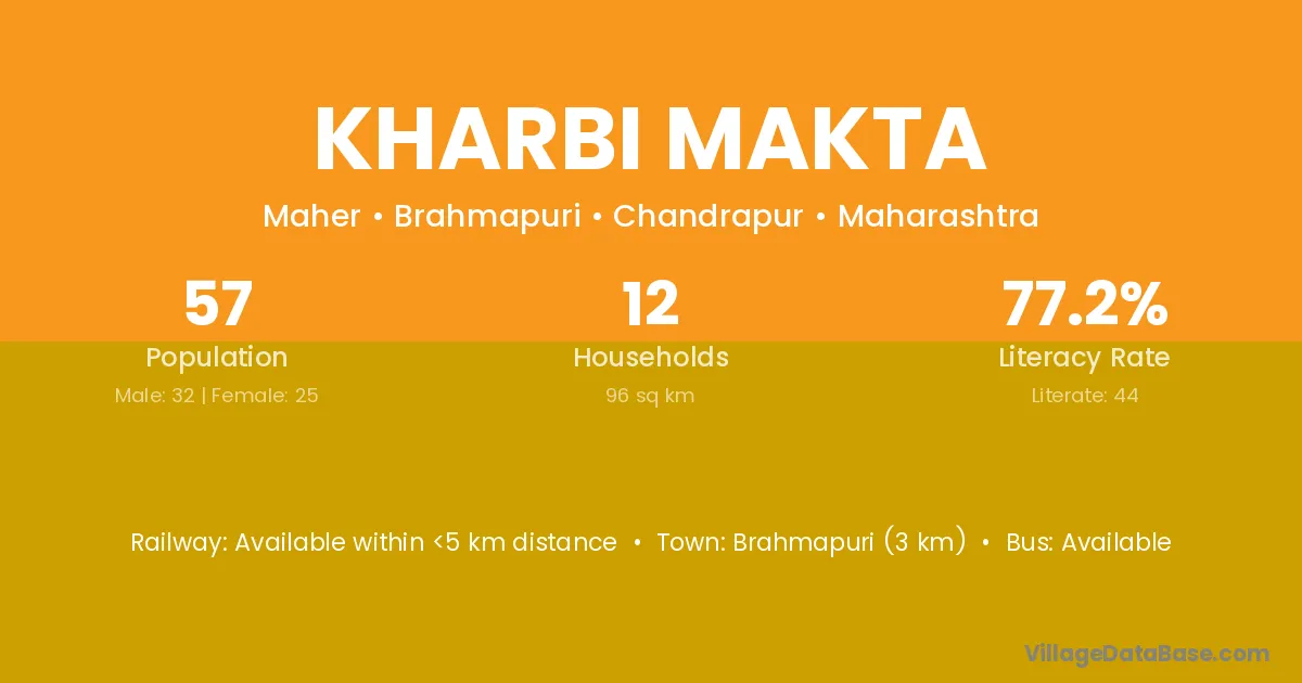 Brahmapuri (3 km) is the nearest town to Kharbi Makta village for major economic activities and is located approximately 3 km away.
