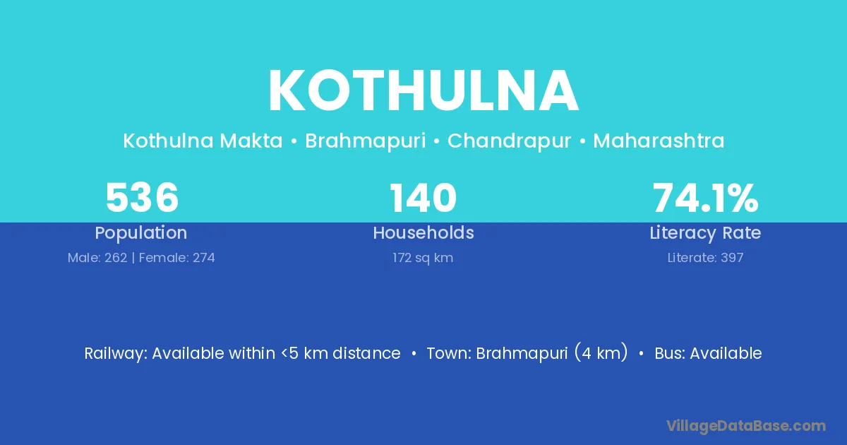 Brahmapuri (4 km) is the nearest town to Kothulna village for major economic activities and is located approximately 4 km away.
