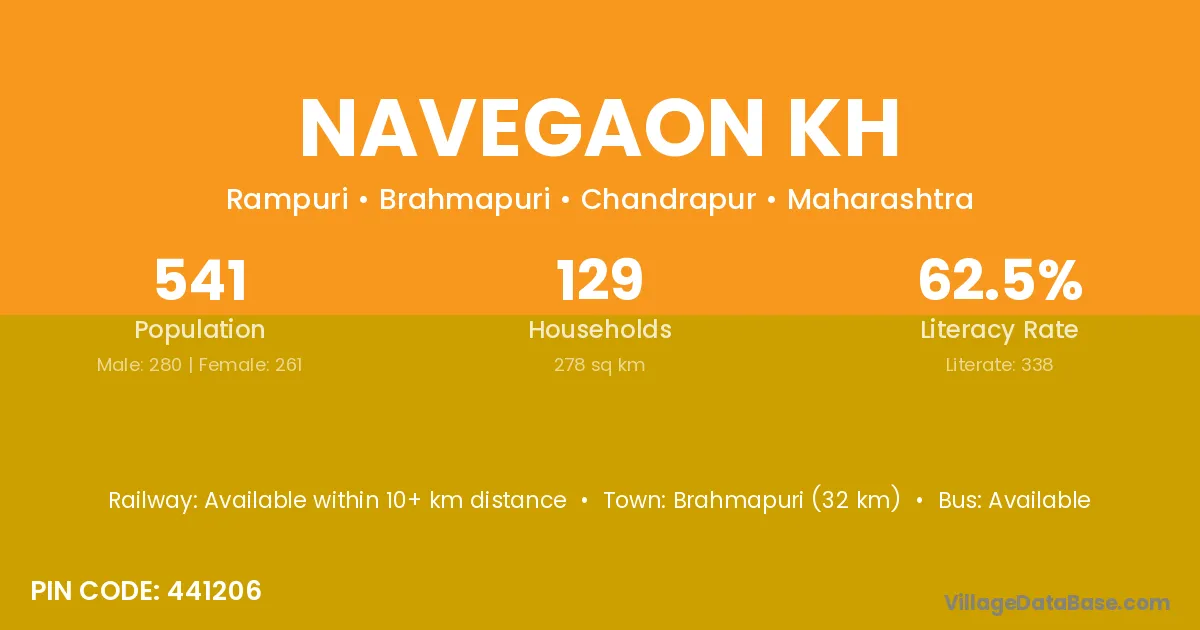 Brahmapuri (32 km) is the nearest town to Navegaon Kh village for major economic activities and is located approximately 32 km away.