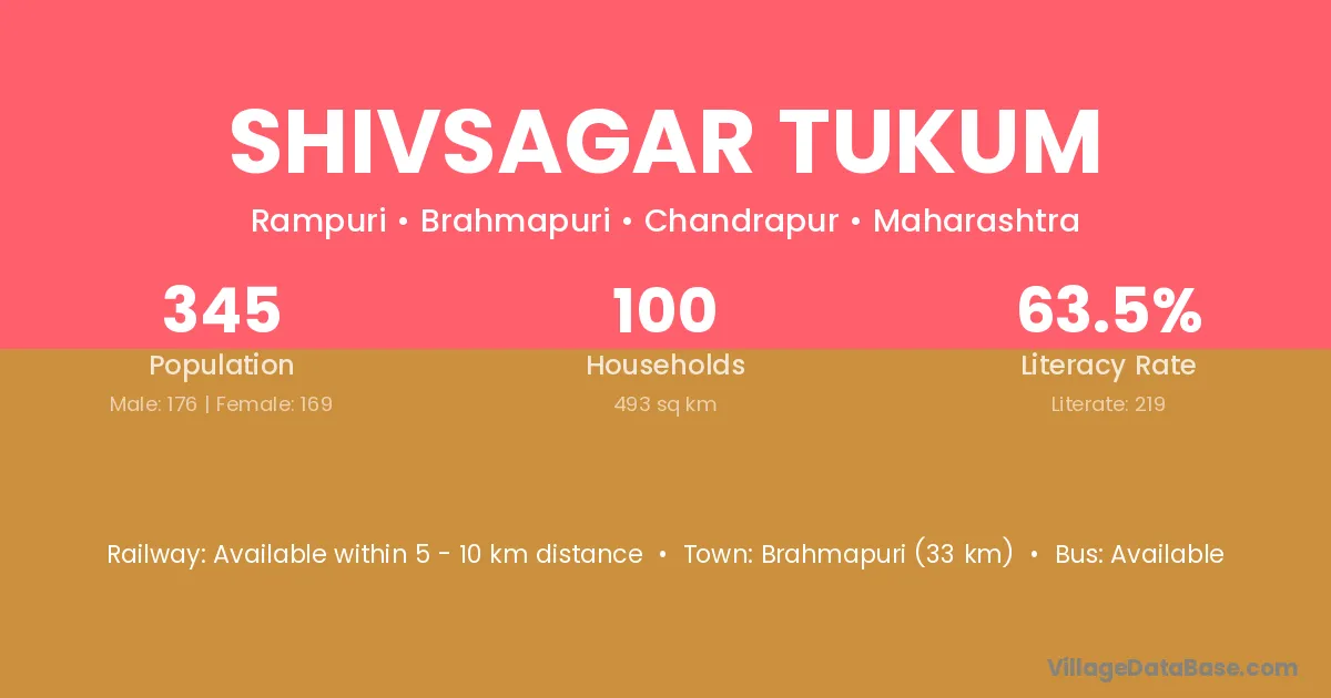 Brahmapuri (33 km) is the nearest town to Shivsagar Tukum village for major economic activities and is located approximately 33 km away.