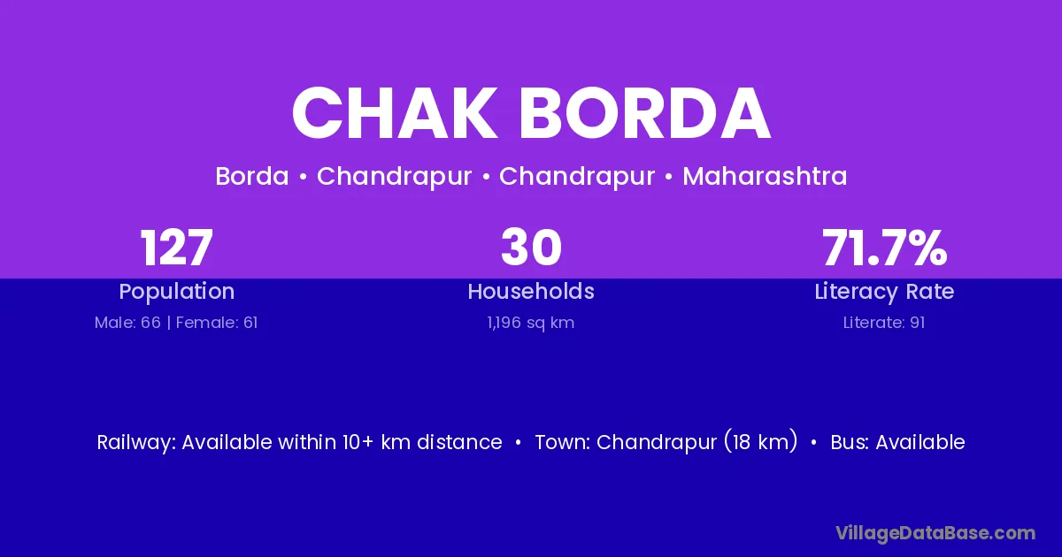 Chandrapur (18 km) is the nearest town to Chak Borda village for major economic activities and is located approximately 18 km away.