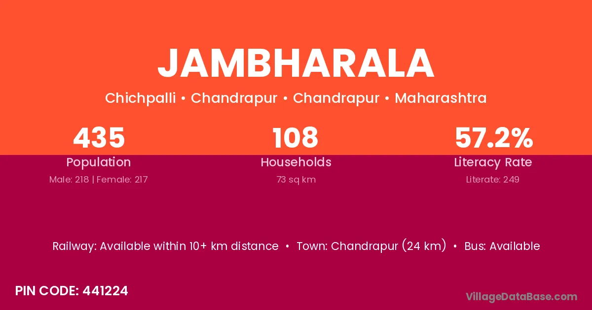 Chandrapur (24 km) is the nearest town to Jambharala village for major economic activities and is located approximately 24 km away.