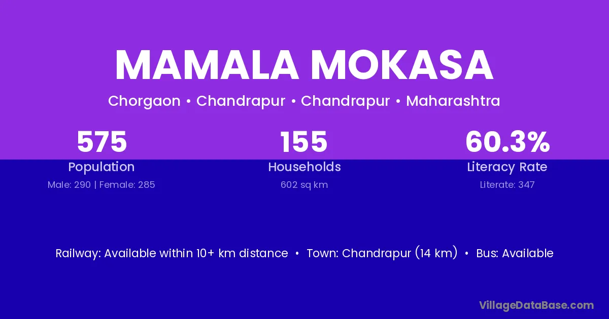 Chandrapur (14 km) is the nearest town to Mamala Mokasa village for major economic activities and is located approximately 14 km away.