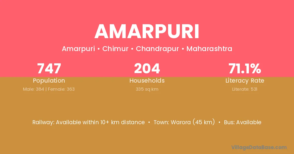 Warora (45 km) is the nearest town to Amarpuri village for major economic activities and is located approximately 45 km away.