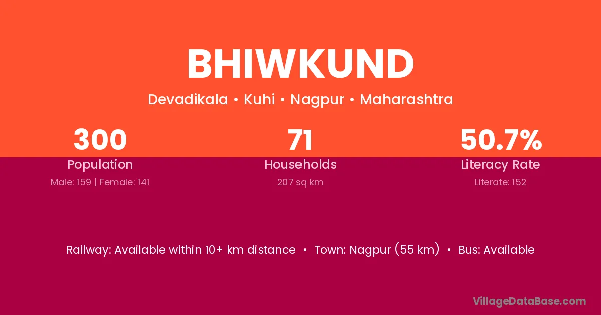 Warora (45 km) is the nearest town to Bhiwkund village for major economic activities and is located approximately 45 km away.