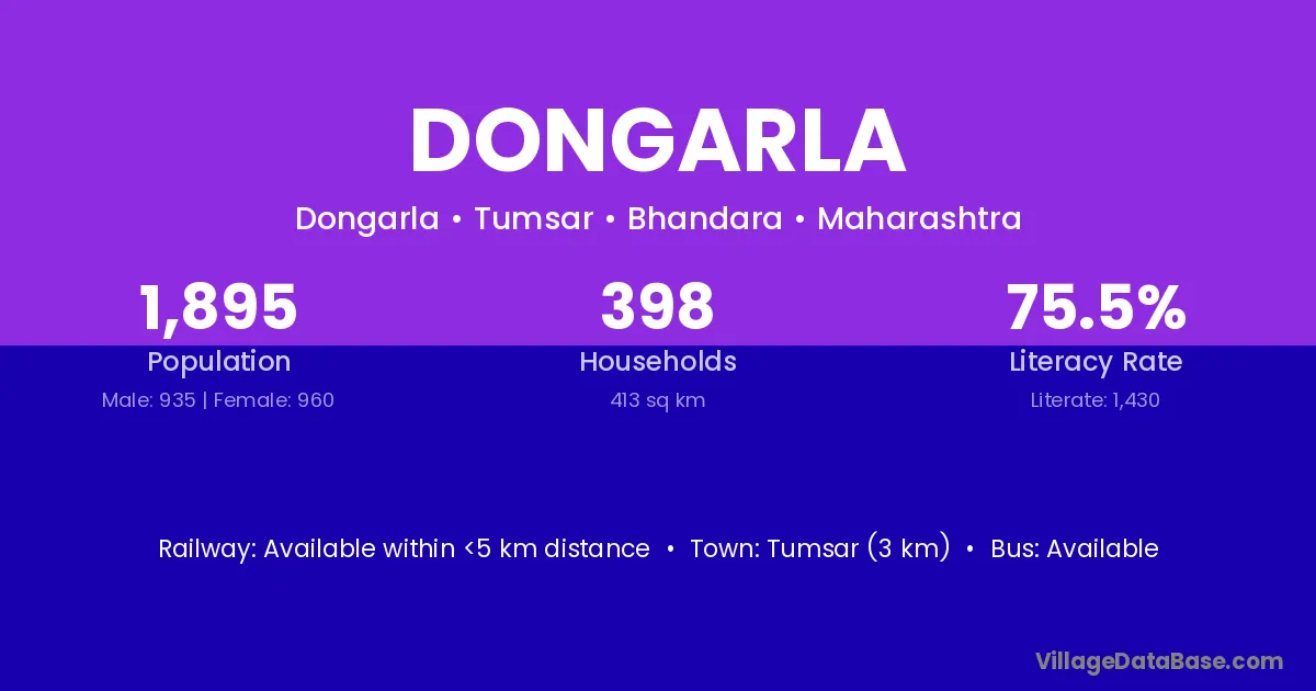 Warora (88 km) is the nearest town to Dongarla village for major economic activities and is located approximately 88 km away.