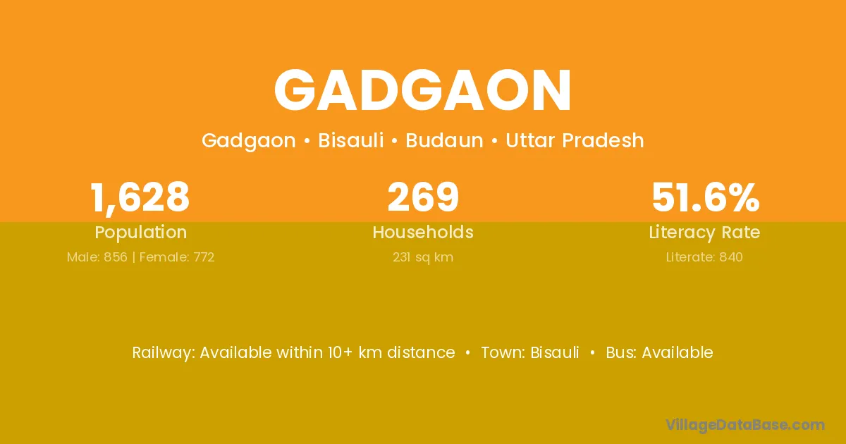 Gadgaon village has a total population of 1,088 people, of which 572 are males and 516 are females.