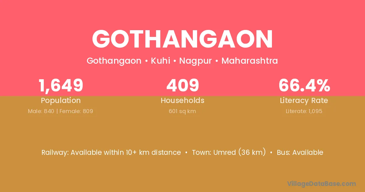Warora (82 km) is the nearest town to Gothangaon village for major economic activities and is located approximately 82 km away.