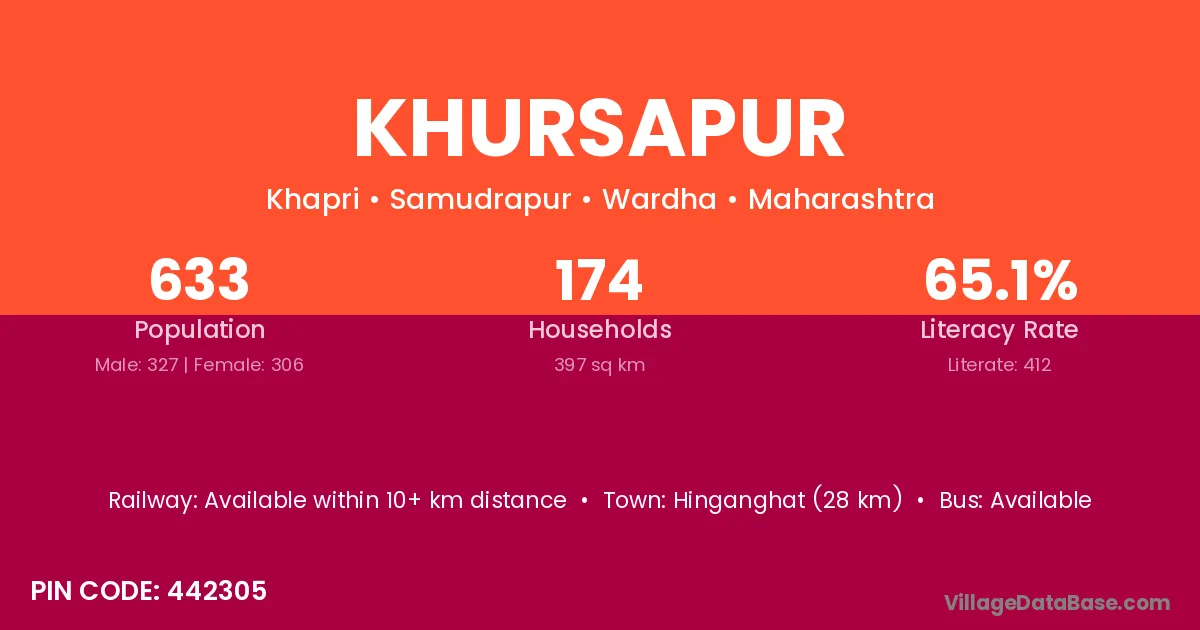 Warora (36 km) is the nearest town to Khursapur village for major economic activities and is located approximately 36 km away.