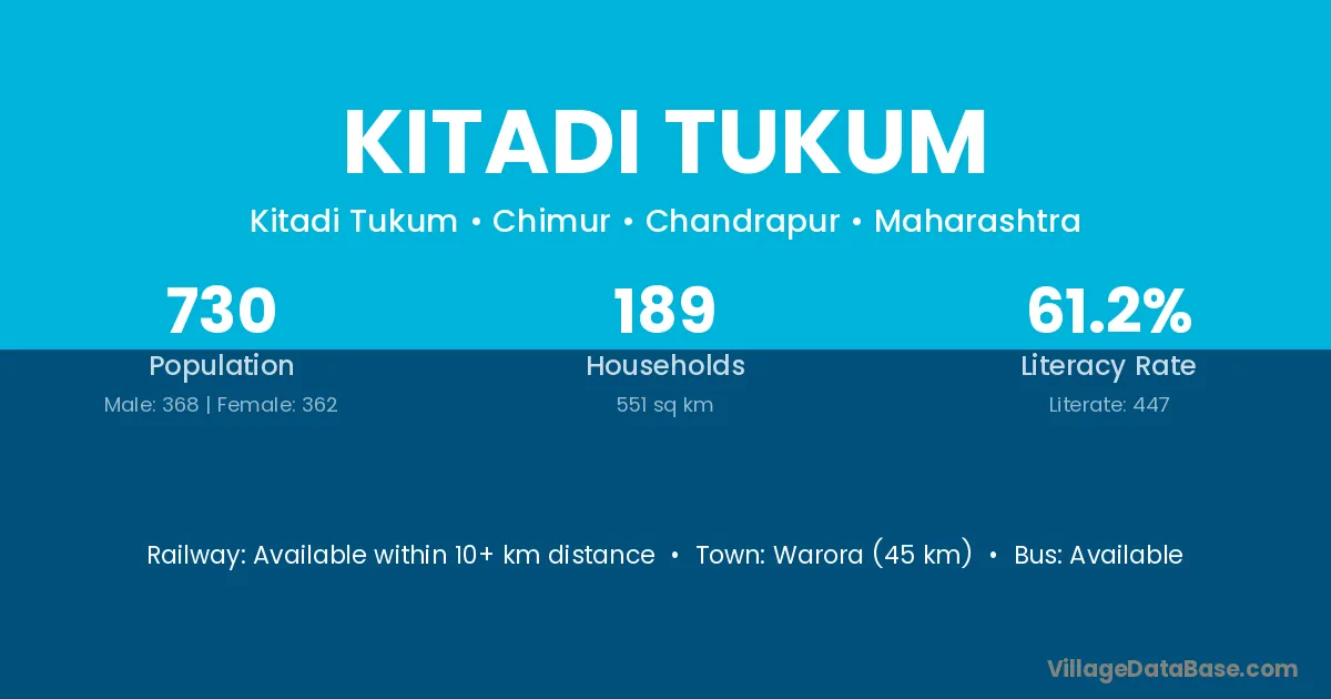 Warora (45 km) is the nearest town to Kitadi Tukum village for major economic activities and is located approximately 45 km away.
