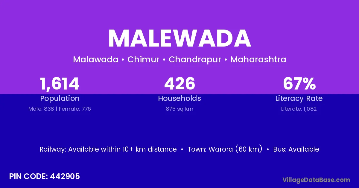 Warora (60 km) is the nearest town to Malewada village for major economic activities and is located approximately 60 km away.