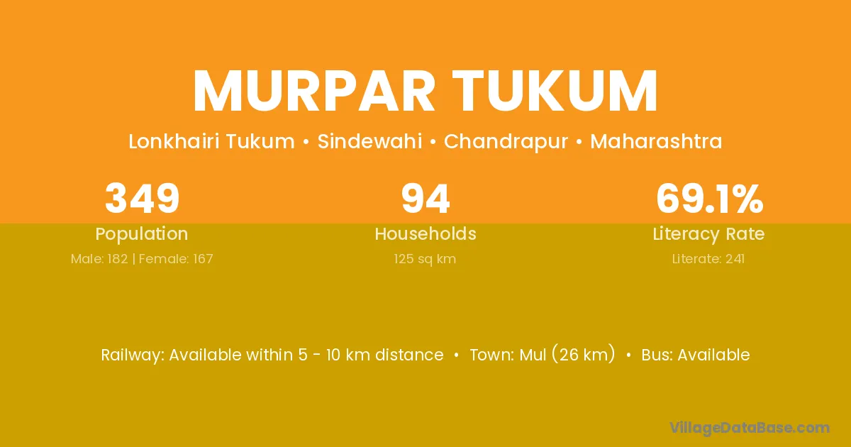 Warora (54 km) is the nearest town to Murpar Tukum village for major economic activities and is located approximately 54 km away.