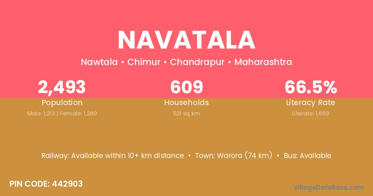 Warora (74 km) is the nearest town to Navatala village for major economic activities and is located approximately 74 km away.